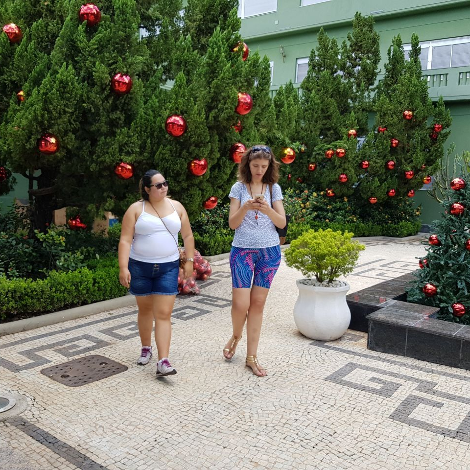 O pai da Nath veio para cá então ganhamos uma carona até o mercado municipal. Ele é bem diferente do de São Paulo: não tem frutas para degustar nem vários lugares vendendo pastel ou sanduíche. É só um corredor com lojas de roupa, acessórios para celular, bolsas e uma lotérica. Na parte de fora, tem açougue, uma pastelaria e várias barbearias. Enfim, gastamos menos de 15 minutos por lá e fomos para a Praça Cívica. Já está toda enfeitada para o Natal 😱. Na frente da estátua, tinham umas pessoas colando uns cartazes e um carinha tocando berrante. Tirei foto da fonte e fomos para a parte de natal.